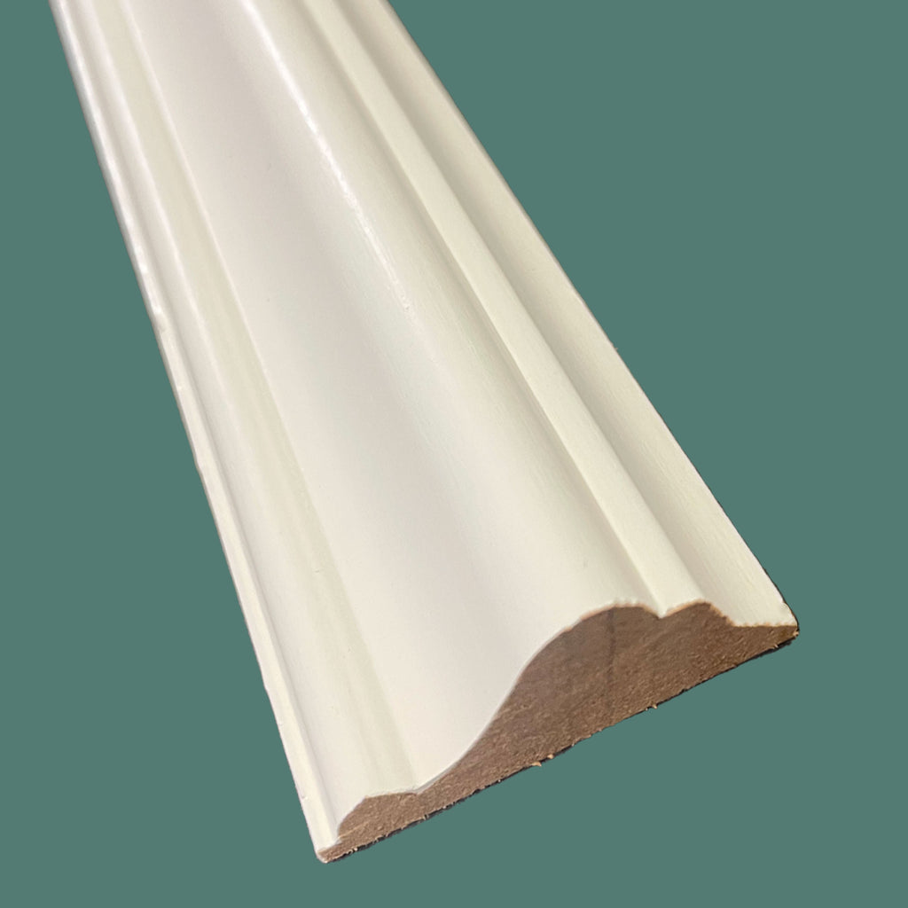 stang på 2,10 lineære meter profil Bugna for Boiserie i massivt træ af Ayous hvidlakeret