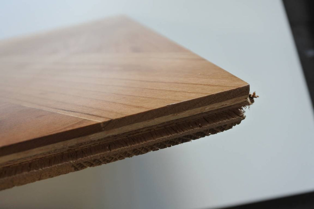3 Schichten: 4 mm Edelholz oben, 4 mm Edelholz unten und 6 mm Zwischenschicht Birke
