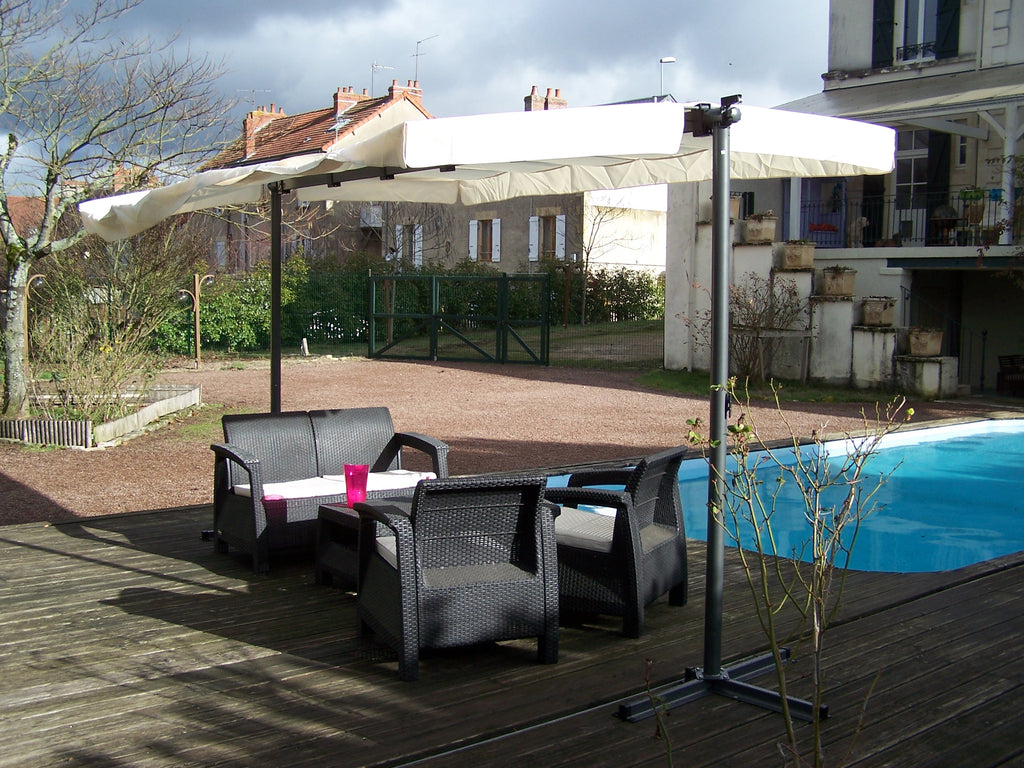 Simple to set up, it has cross legs that can accommodate counterweight plates (not supplied) guaranteeing its resistance in areas with strong winds.