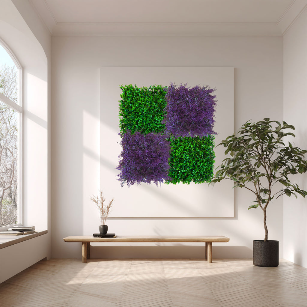 Pannelli Verde Verticale 50×50 cm Ultra-realistici e folti, per interno/esterno EUCALIPTO VIOLA - Eternal Parquet con incastri