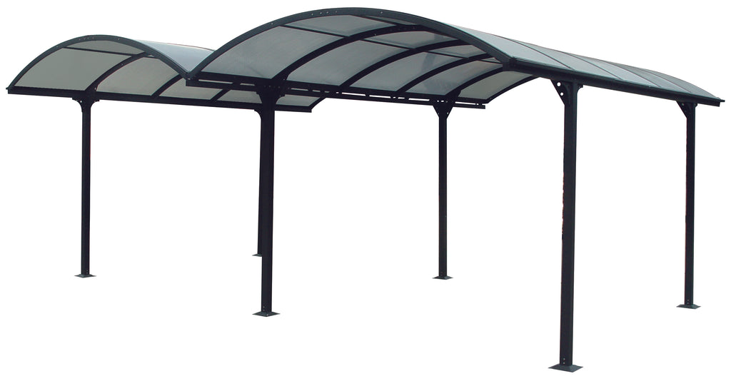 Noapaļota nojume 2 stāvvietām no alumīnija un šūnveida polikarbonāta 600x480cm
