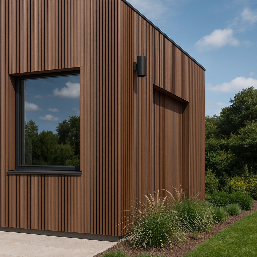 Rivestimento a lamelli forato in WPC (Wood Plastic Composite), ideale per pareti esterne, recinzioni, sottotetti e rivestimenti decorativi.