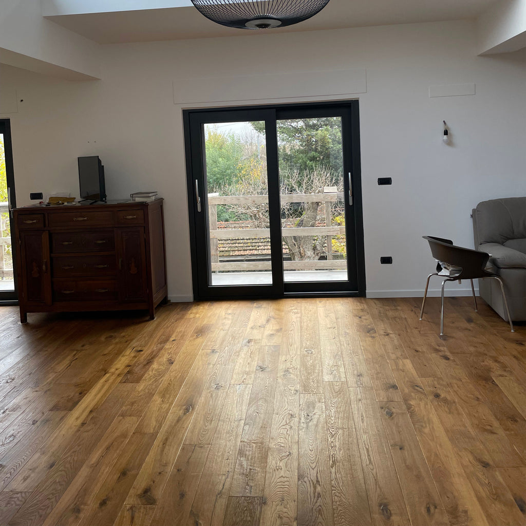 Maxilistone parquet "I MANUFATTI" quercia Thermo Olio/Cera 12x158x600/1830 piallata, levigata e bisellata a mano, controbilanciata in rovere per posa incollata o flottante, ottimi su sottofondi riscaldati.