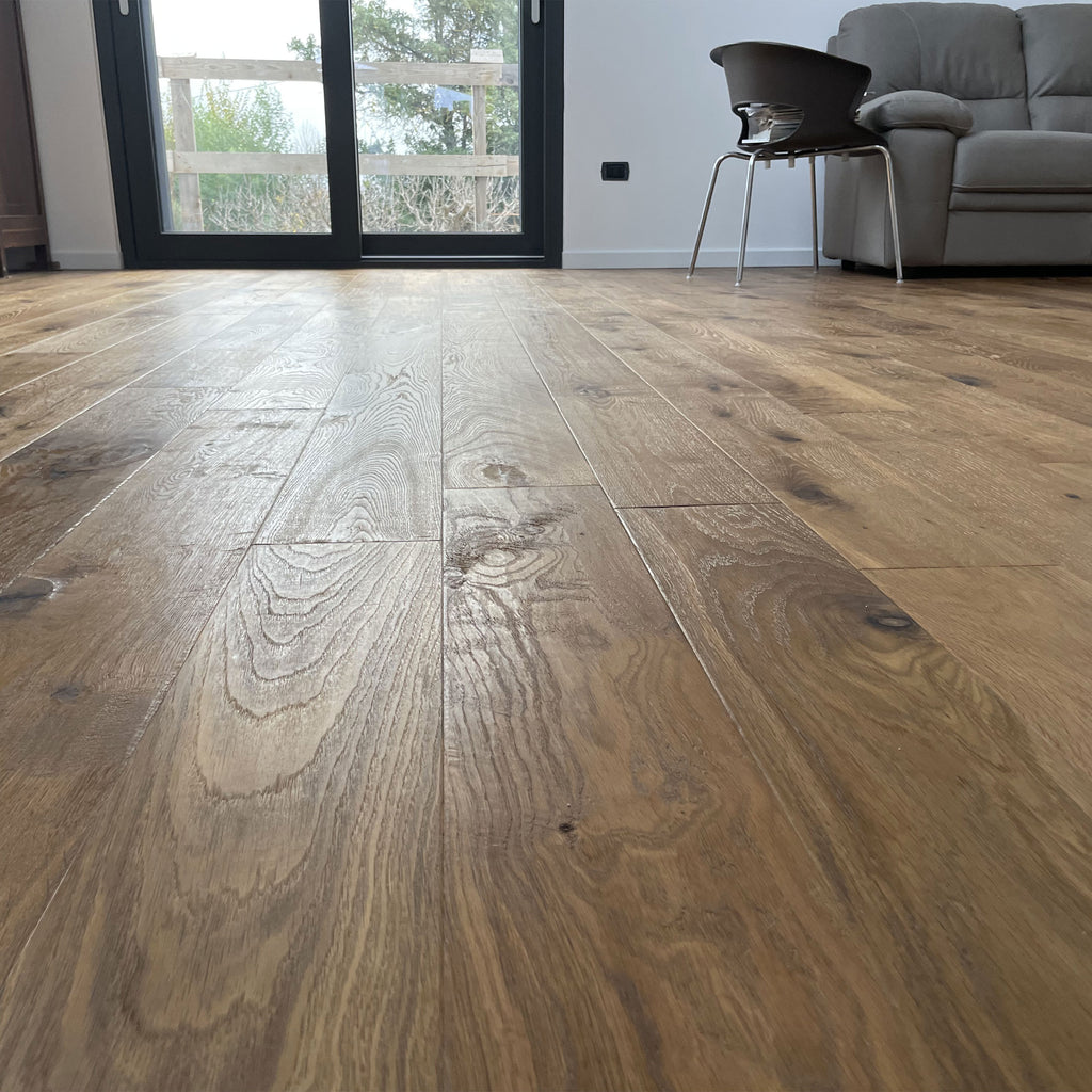 I listoni vengono levigati a mano in modo che le zone più dure (come i nodi), restino in superficie creando un effetto a rilievo, dopodichè vengono stuccate, piallate e bisellate interamente a mano, infine viene dato accuratamente dell'olio naturale a straccio in più mani ed infine un sottile velo di ceratura sempre strofinato a mano fino ad ottenere un effetto setoso e brillante.