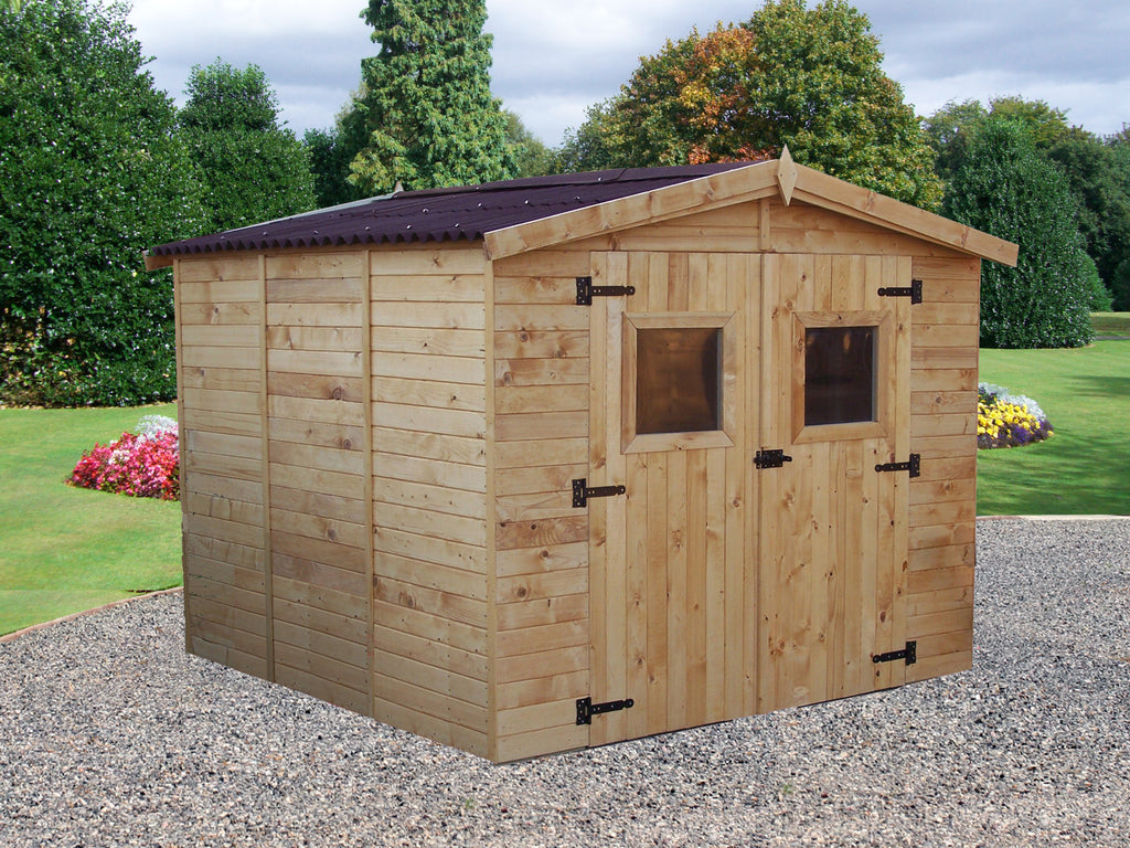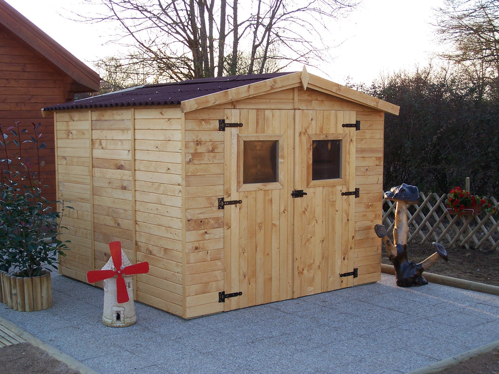 Väggar: Förmonterade granpaneler med hyvlade granplankor, med spår och tabbar, tjocklek 16mm, fixerade på ramsektion 25x25mm.